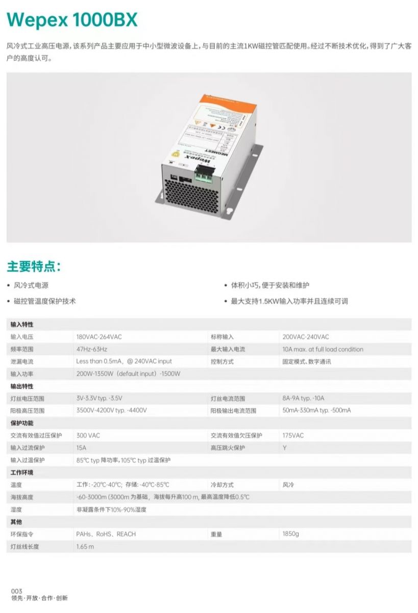 1000BX風(fēng)冷微波電源主要用于箱式工業(yè)微波爐,小型隧道式微波干燥機,中型微波殺菌機;一般工作時間不長,每個班4個小時的可以采用1000BX微波電源,本公司提供各種風(fēng)冷微波電源,水冷微波電源,油浸水冷微波電源;各種風(fēng)冷三星磁控管,三星水冷磁控管,東芝風(fēng)冷磁控管,東芝水冷磁控管,威特風(fēng)冷磁控管,威特水冷磁控管;本公司提供配件銷售,微波干燥機維修,微波殺菌機升級改裝,微波真空干燥機保養(yǎng),工業(yè)微波設(shè)備設(shè)計與技術(shù)服務(wù),歡迎來電咨詢。